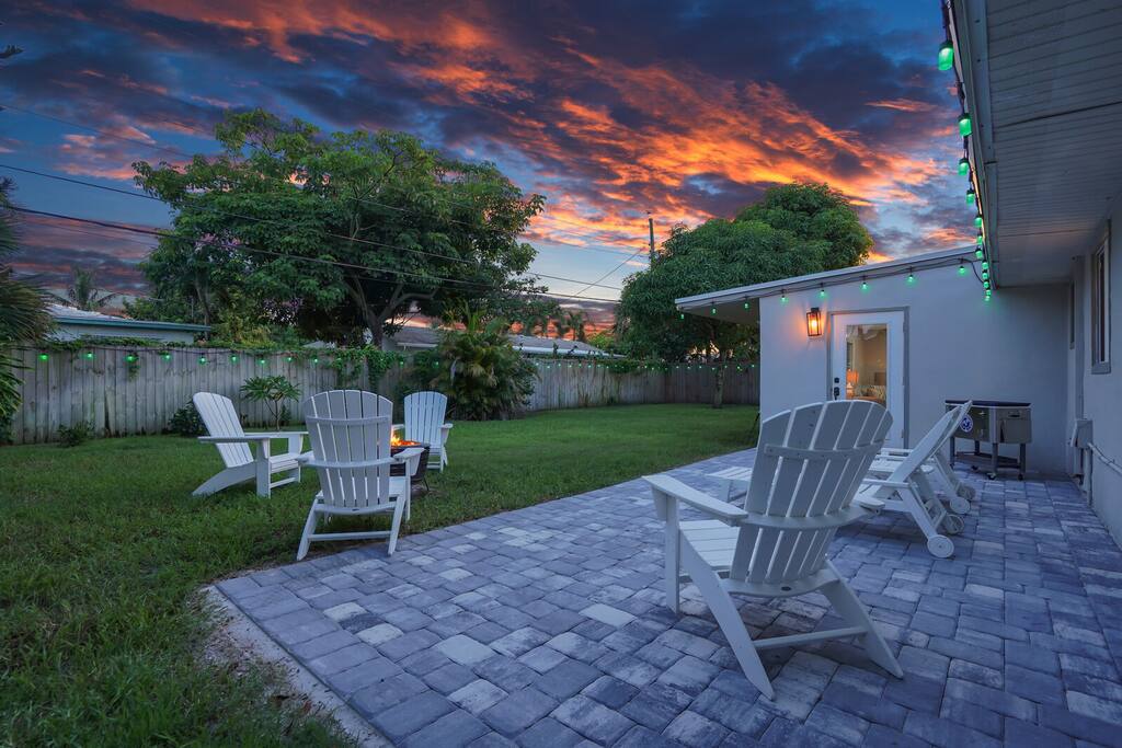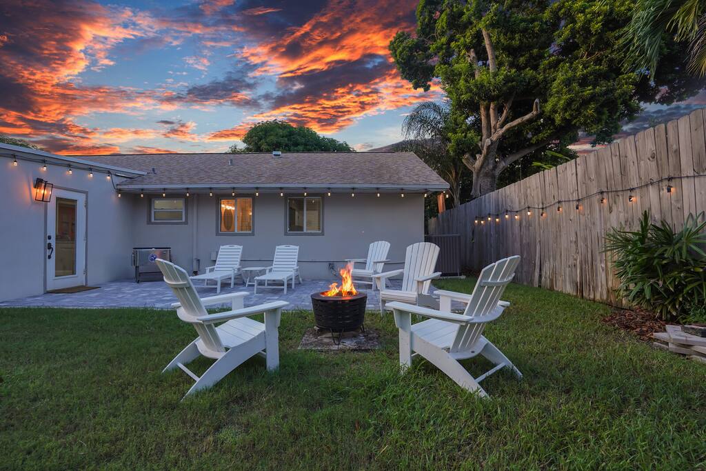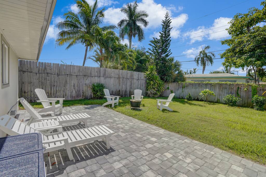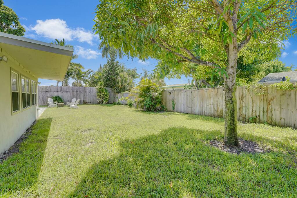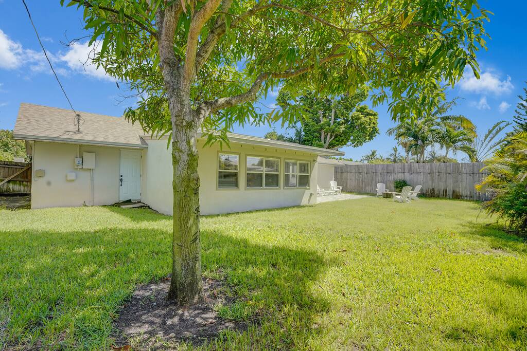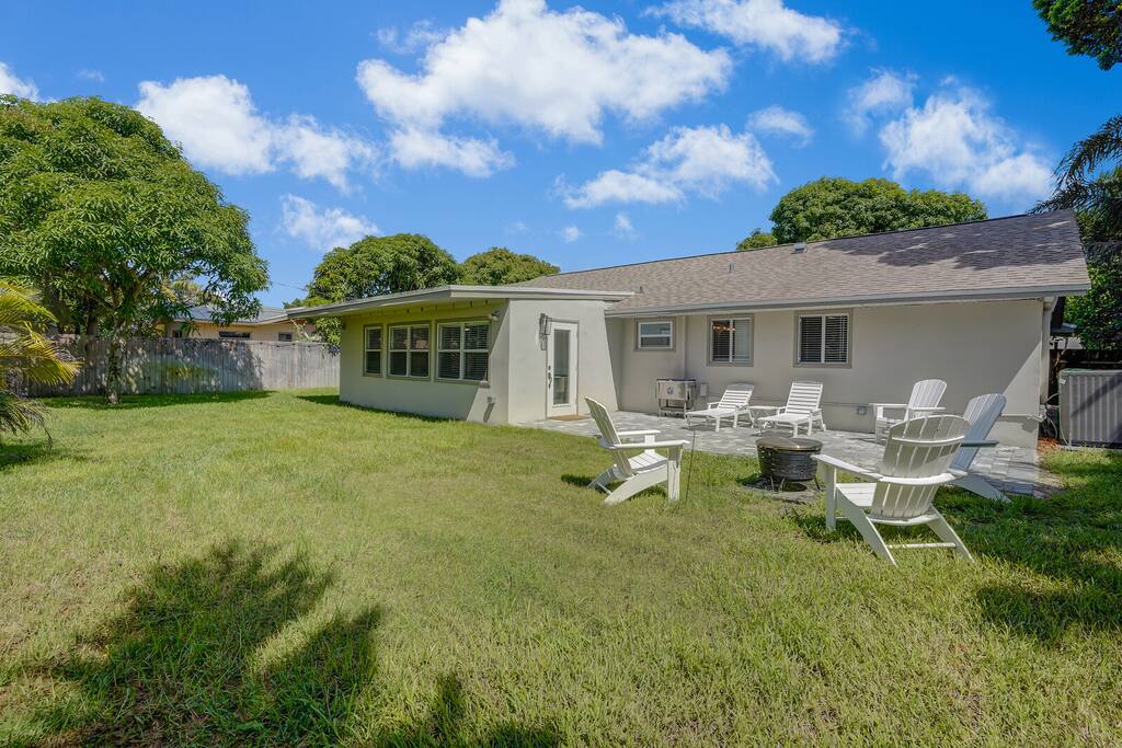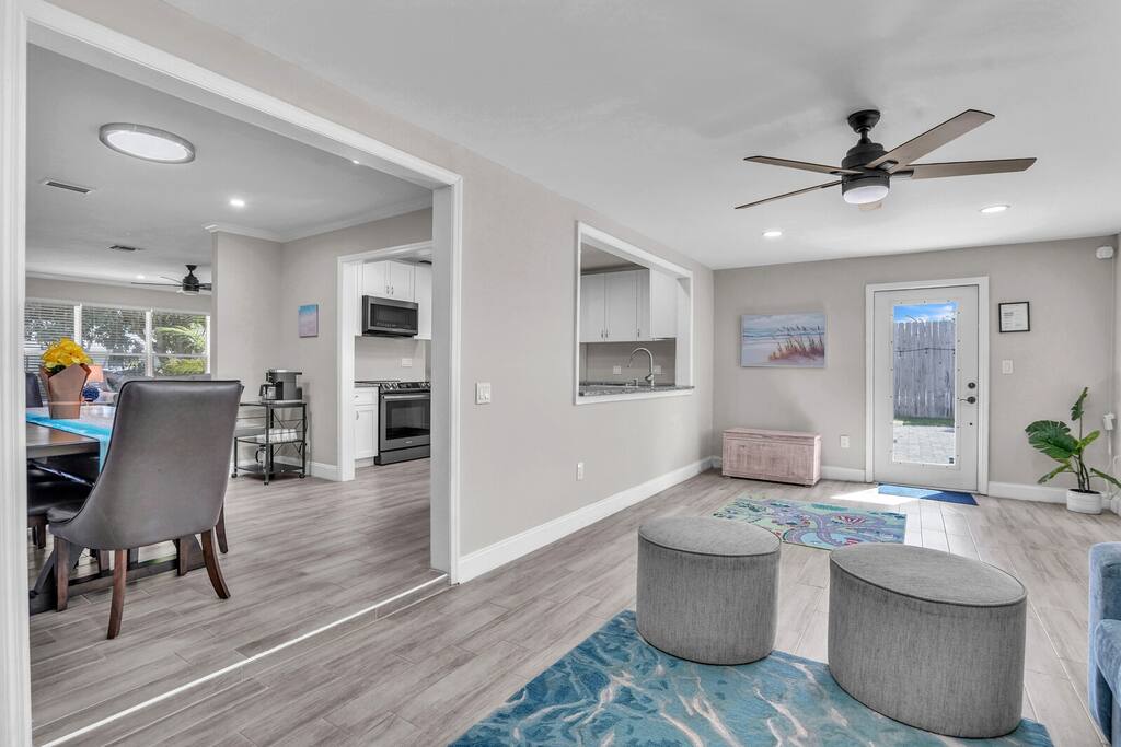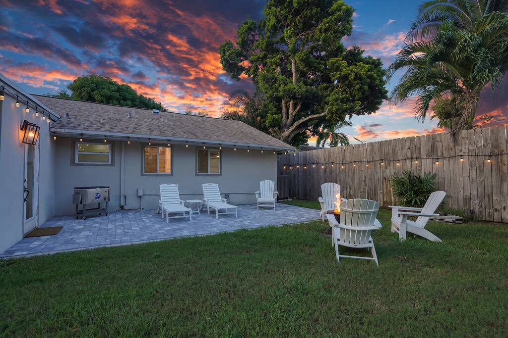This recently-renovated single-level retreat features tile plank floors throughout, air conditioning and ceiling fans in every room, cordless blinds, and high-end appliances. The home offers 2 spacious living areas, a large dining table, 3 bedrooms, and a private backyard with a NEW large patio. Outdoor group games like cornhole and giant yard dice are provided, in addition to board games and indoor games if the weather isn’t ideal for outdoor fun. All visits 28 days or longer require signing a lease by all individuals 18+ at least 2 weeks prior to the stay. :-) GREAT ROOM Step into a generously sized great room with two full-sized couches (one a queen sleeper sofa) and a 65" flat-screen TV with Roku, giving you access to your personal streaming apps like Netflix, Amazon Prime, Disney+, and Hulu. Roku's guest mode automatically logs out of all apps at the end of your stay. DINING ROOM The great room opens to the dining room, featuring an expandable table with seating for 8–10. KITCHEN The well-appointed kitchen includes a toaster oven, blender, food processor, pots & pans, colanders, a Keurig combo coffee maker, and a healthy assortment of cooking utensils. It can be accessed from both the Great Room and Dining Room and overlooks the Florida Room. FLORIDA ROOM The Florida Room is a second living space at the back of the house, filled with natural light from south-facing windows. It includes another full-size sofa, a 58" TV, and space for a kids’ play area- perfect for little ones to enjoy while you relax. OUTSIDE The Florida Room opens to a private, fully fenced backyard (over 2,200 sq. ft.) with plenty of room for outdoor games and relaxation. Enjoy the NEW 300 square foot patio, chaise loungers and Adirondack chairs for sun or reading, a smokeless fire pit (S'mores, anyone?), and a pair of mango trees- feel free to help yourself when in season. If bringing your dog, let us know so we can leave out dog toys. BEDROOMS The hallway off the Great Room leads to the bedrooms and bathrooms. The primary bedroom has a king bed, a Roku TV (bring your streaming passwords; guest mode automatically signs you out at checkout!), and an en-suite bathroom with dual vanities and a shower with multiple settings, including a rainfall option. The 2nd and 3rd bedrooms each feature a queen bed, a Roku TV, and blackout curtains. Bedroom 2 also features a workspace (42” desk, monitor, and ergonomic desk chair). All bedrooms have remote-controlled ceiling fans, USB charging plugs, nightstands, and ample closet and drawer space. BATHROOMS The primary bathroom is a ¾ bath with dual vanities and a multi-setting shower. Guests have access to a hairdryer and starter toiletries. The 2nd bathroom features a combination tub/shower, plenty of counter space, and a spa tray for wine and Kindle enjoyment. BEACH SUPPLIES The guest closet between the primary and 2nd bedrooms houses beach supplies: beach toys, a beach blanket, a backpack cooler, 2 chairs, a beach umbrella, and towels for easy beach days.