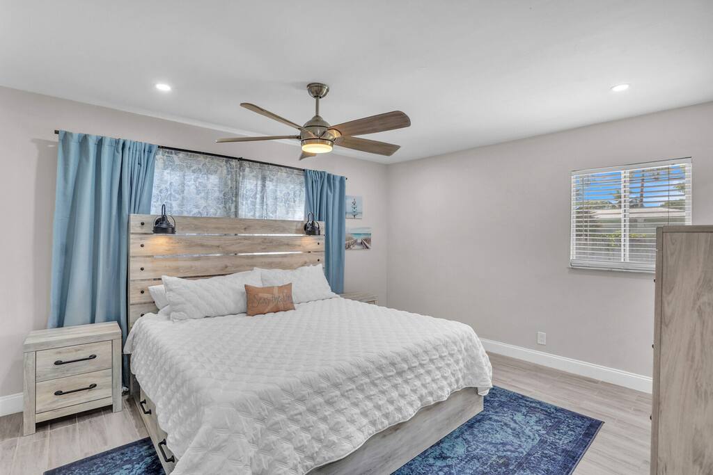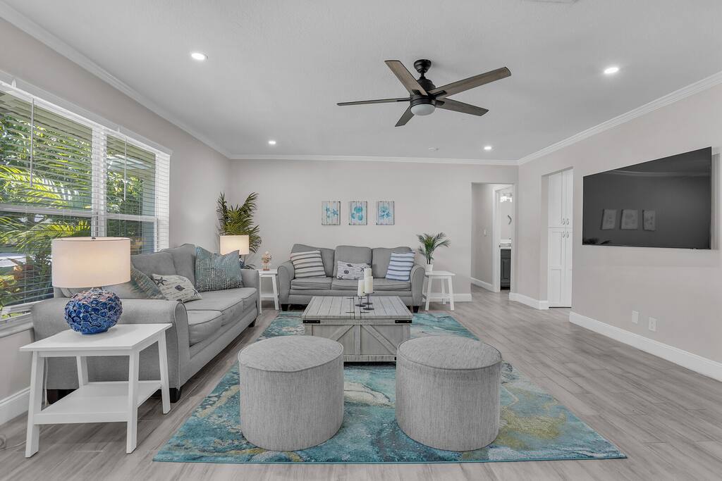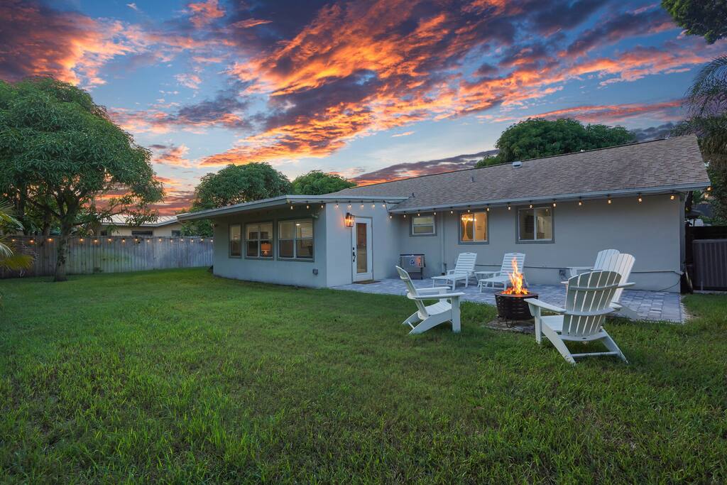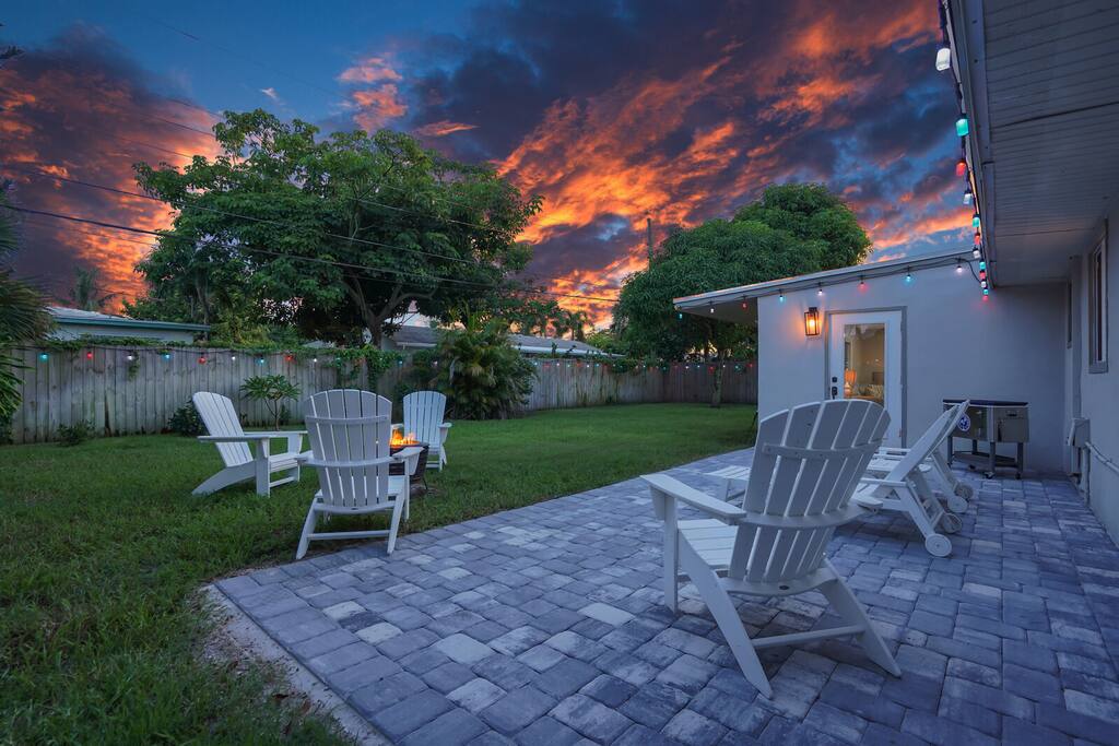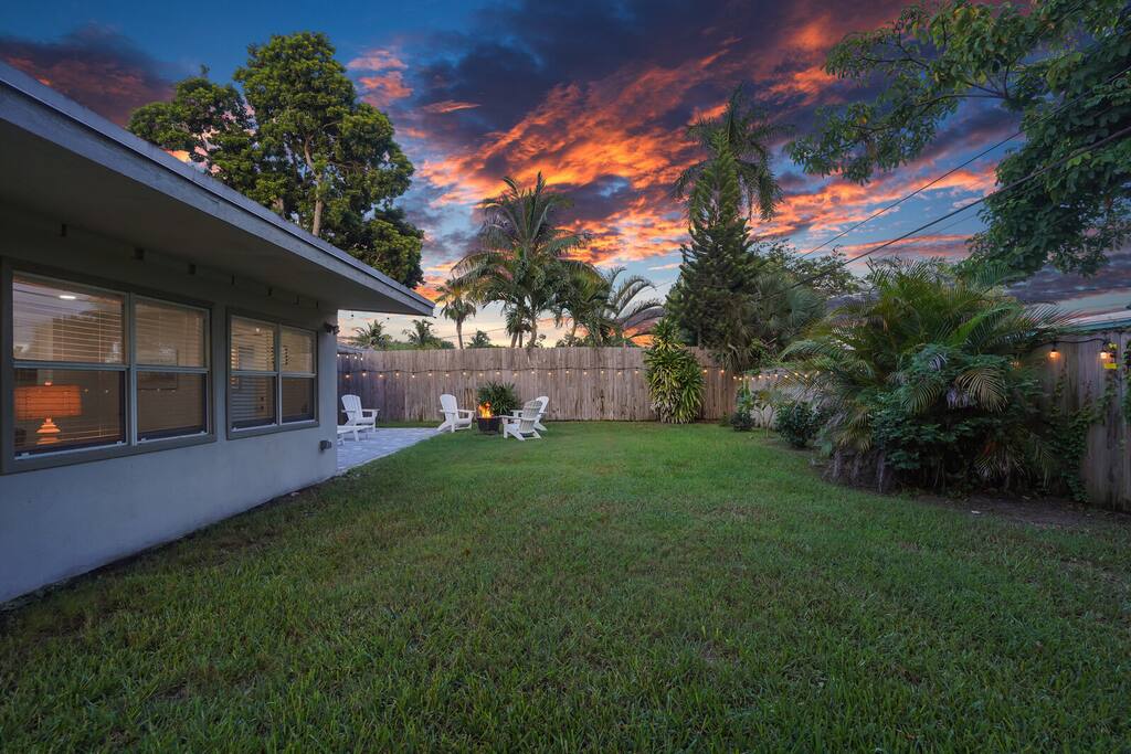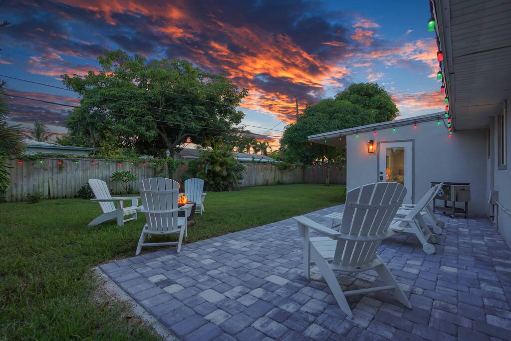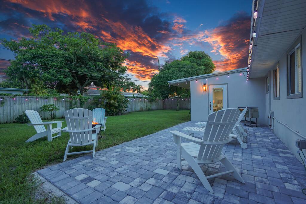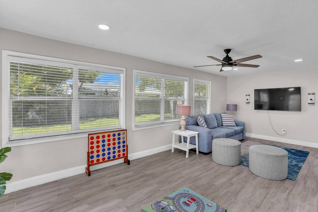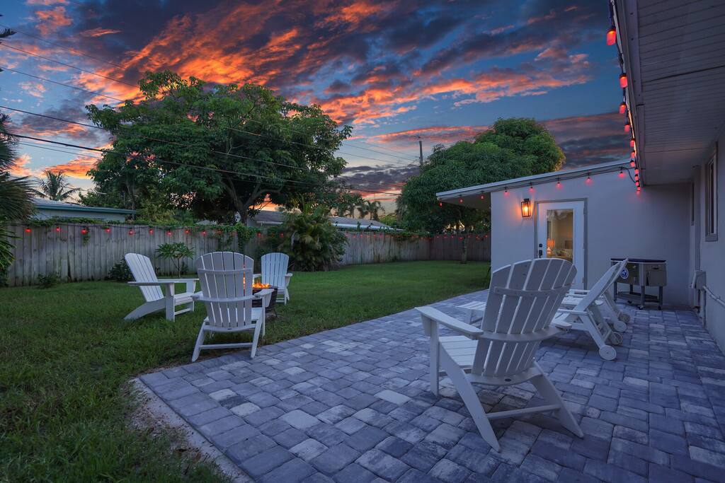 This recently-renovated single-level retreat features tile plank floors throughout, air conditioning and ceiling fans in every room, cordless blinds, and high-end appliances. The home offers 2 spacious living areas, a large dining table, 3 bedrooms, and a private backyard with a NEW large patio. Outdoor group games like cornhole and giant yard dice are provided, in addition to board games and indoor games if the weather isn’t ideal for outdoor fun. All visits 28 days or longer require signing a lease by all individuals 18+ at least 2 weeks prior to the stay. :-) GREAT ROOM Step into a generously sized great room with two full-sized couches (one a queen sleeper sofa) and a 65" flat-screen TV with Roku, giving you access to your personal streaming apps like Netflix, Amazon Prime, Disney+, and Hulu. Roku's guest mode automatically logs out of all apps at the end of your stay. DINING ROOM The great room opens to the dining room, featuring an expandable table with seating for 8–10. KITCHEN The well-appointed kitchen includes a toaster oven, blender, food processor, pots & pans, colanders, a Keurig combo coffee maker, and a healthy assortment of cooking utensils. It can be accessed from both the Great Room and Dining Room and overlooks the Florida Room. FLORIDA ROOM The Florida Room is a second living space at the back of the house, filled with natural light from south-facing windows. It includes another full-size sofa, a 58" TV, and space for a kids’ play area- perfect for little ones to enjoy while you relax. OUTSIDE The Florida Room opens to a private, fully fenced backyard (over 2,200 sq. ft.) with plenty of room for outdoor games and relaxation. Enjoy the NEW 300 square foot patio, chaise loungers and Adirondack chairs for sun or reading, a smokeless fire pit (S'mores, anyone?), and a pair of mango trees- feel free to help yourself when in season. If bringing your dog, let us know so we can leave out dog toys. BEDROOMS The hallway off the Great Room leads to the bedrooms and bathrooms. The primary bedroom has a king bed, a Roku TV (bring your streaming passwords; guest mode automatically signs you out at checkout!), and an en-suite bathroom with dual vanities and a shower with multiple settings, including a rainfall option. The 2nd and 3rd bedrooms each feature a queen bed, a Roku TV, and blackout curtains. Bedroom 2 also features a workspace (42” desk, monitor, and ergonomic desk chair). All bedrooms have remote-controlled ceiling fans, USB charging plugs, nightstands, and ample closet and drawer space. BATHROOMS The primary bathroom is a ¾ bath with dual vanities and a multi-setting shower. Guests have access to a hairdryer and starter toiletries. The 2nd bathroom features a combination tub/shower, plenty of counter space, and a spa tray for wine and Kindle enjoyment. BEACH SUPPLIES The guest closet between the primary and 2nd bedrooms houses beach supplies: beach toys, a beach blanket, a backpack cooler, 2 chairs, a beach umbrella, and towels for easy beach days.