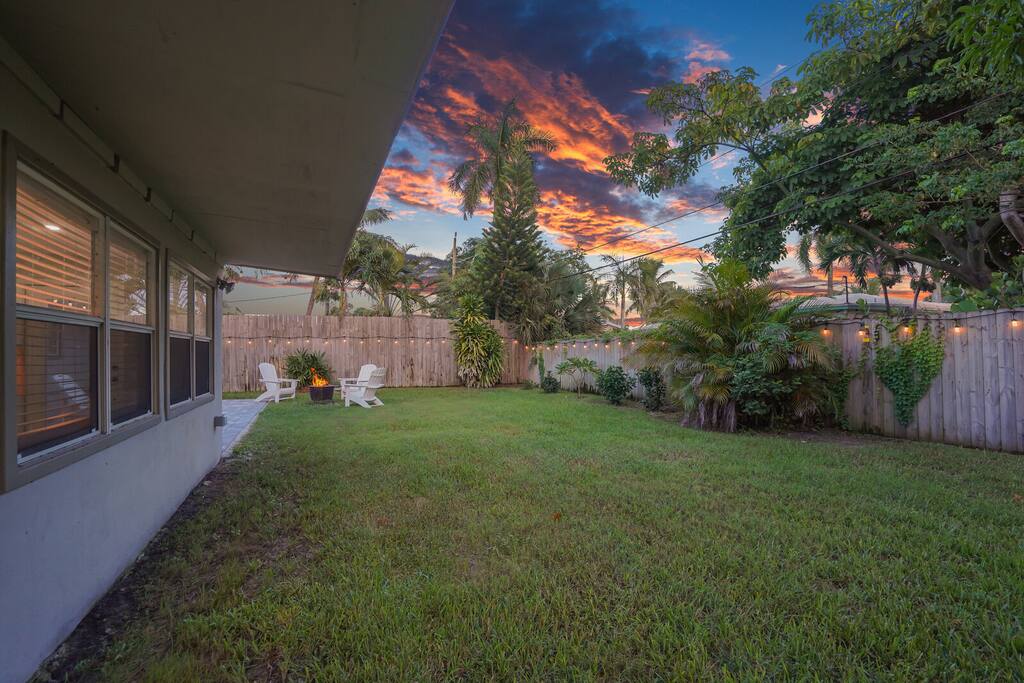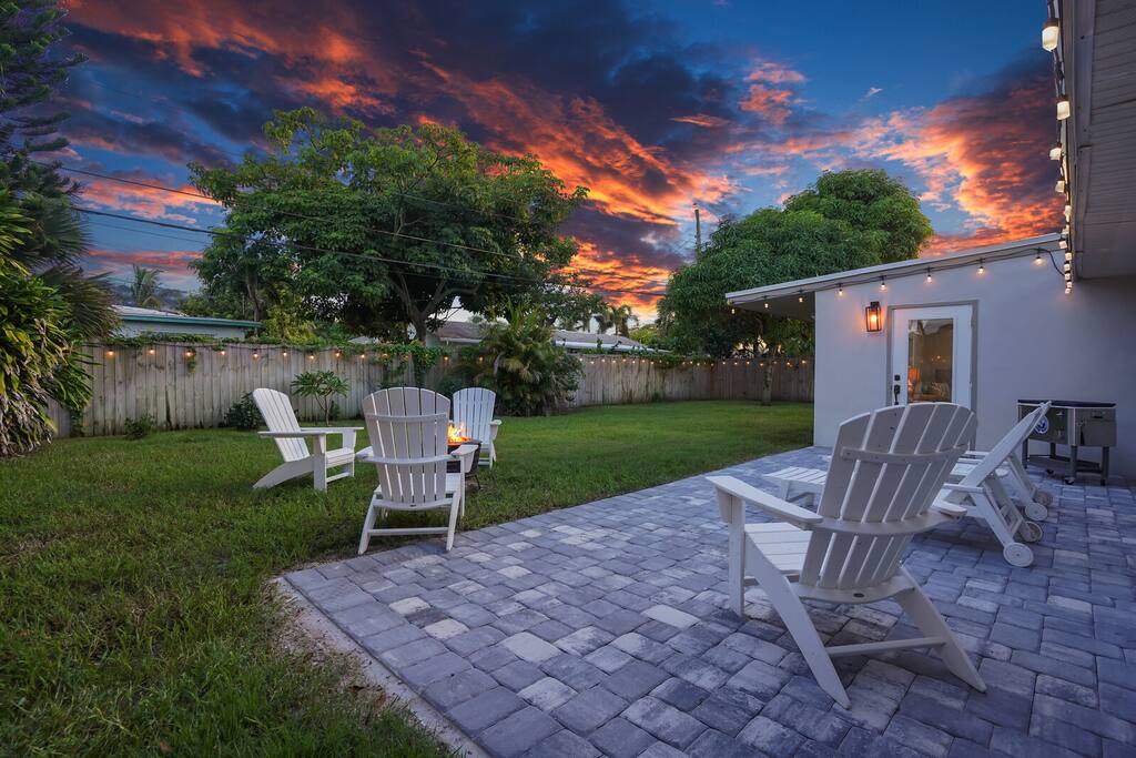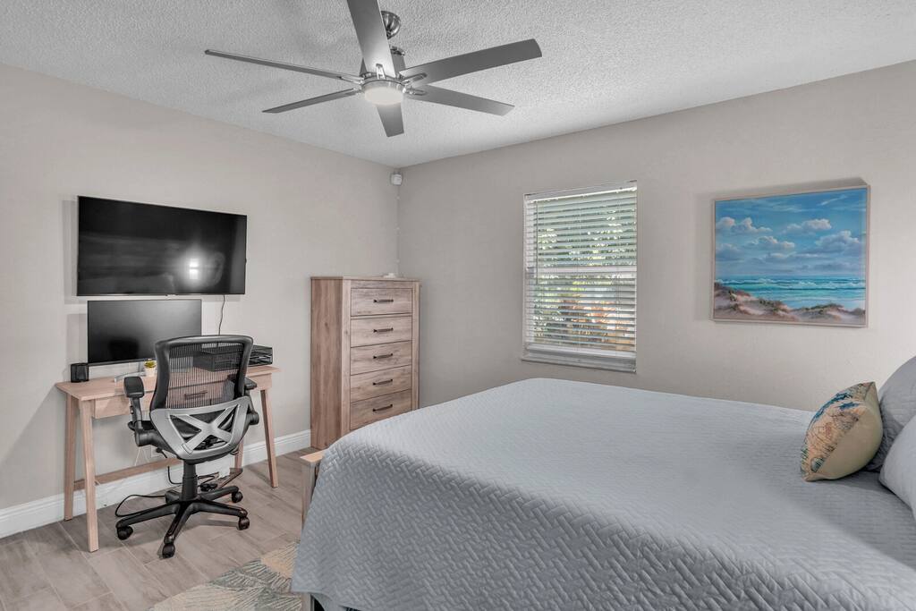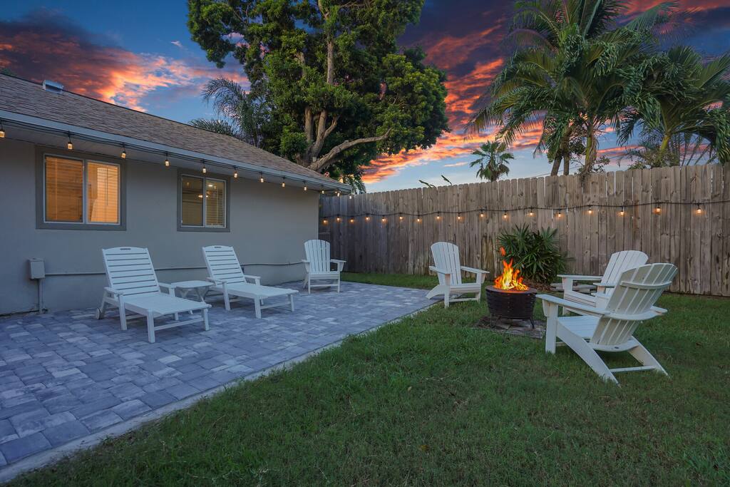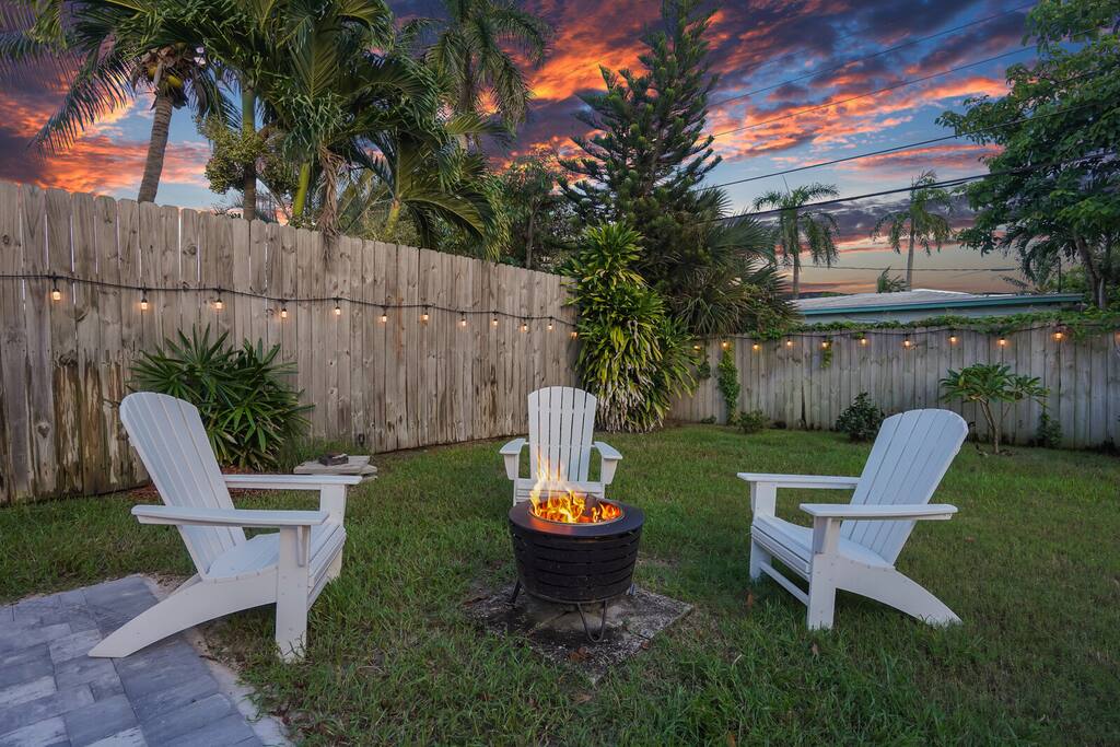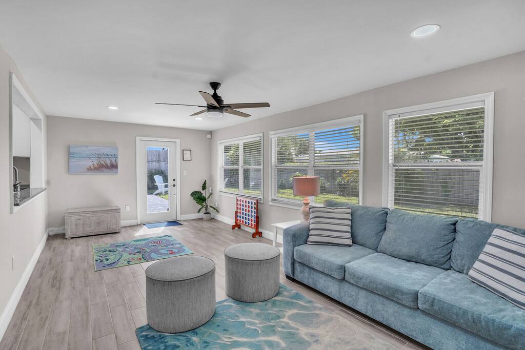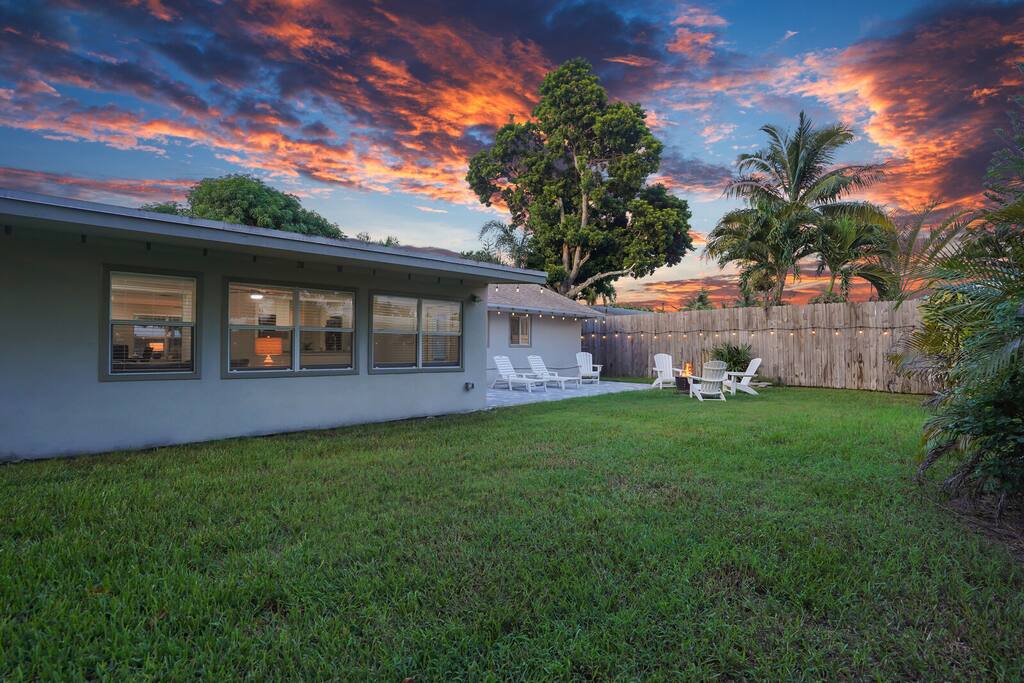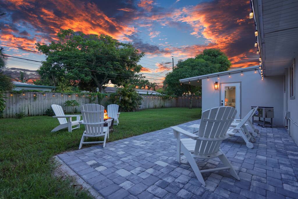 This recently-renovated single-level retreat features tile plank floors throughout, air conditioning and ceiling fans in every room, cordless blinds, and high-end appliances. The home offers 2 spacious living areas, a large dining table, 3 bedrooms, and a private backyard with a NEW large patio. Outdoor group games like cornhole and giant yard dice are provided, in addition to board games and indoor games if the weather isn’t ideal for outdoor fun. All visits 28 days or longer require signing a lease by all individuals 18+ at least 2 weeks prior to the stay. :-) GREAT ROOM Step into a generously sized great room with two full-sized couches (one a queen sleeper sofa) and a 65" flat-screen TV with Roku, giving you access to your personal streaming apps like Netflix, Amazon Prime, Disney+, and Hulu. Roku's guest mode automatically logs out of all apps at the end of your stay. DINING ROOM The great room opens to the dining room, featuring an expandable table with seating for 8–10. KITCHEN The well-appointed kitchen includes a toaster oven, blender, food processor, pots & pans, colanders, a Keurig combo coffee maker, and a healthy assortment of cooking utensils. It can be accessed from both the Great Room and Dining Room and overlooks the Florida Room. FLORIDA ROOM The Florida Room is a second living space at the back of the house, filled with natural light from south-facing windows. It includes another full-size sofa, a 58" TV, and space for a kids’ play area- perfect for little ones to enjoy while you relax. OUTSIDE The Florida Room opens to a private, fully fenced backyard (over 2,200 sq. ft.) with plenty of room for outdoor games and relaxation. Enjoy the NEW 300 square foot patio, chaise loungers and Adirondack chairs for sun or reading, a smokeless fire pit (S'mores, anyone?), and a pair of mango trees- feel free to help yourself when in season. If bringing your dog, let us know so we can leave out dog toys. BEDROOMS The hallway off the Great Room leads to the bedrooms and bathrooms. The primary bedroom has a king bed, a Roku TV (bring your streaming passwords; guest mode automatically signs you out at checkout!), and an en-suite bathroom with dual vanities and a shower with multiple settings, including a rainfall option. The 2nd and 3rd bedrooms each feature a queen bed, a Roku TV, and blackout curtains. Bedroom 2 also features a workspace (42” desk, monitor, and ergonomic desk chair). All bedrooms have remote-controlled ceiling fans, USB charging plugs, nightstands, and ample closet and drawer space. BATHROOMS The primary bathroom is a ¾ bath with dual vanities and a multi-setting shower. Guests have access to a hairdryer and starter toiletries. The 2nd bathroom features a combination tub/shower, plenty of counter space, and a spa tray for wine and Kindle enjoyment. BEACH SUPPLIES The guest closet between the primary and 2nd bedrooms houses beach supplies: beach toys, a beach blanket, a backpack cooler, 2 chairs, a beach umbrella, and towels for easy beach days.
