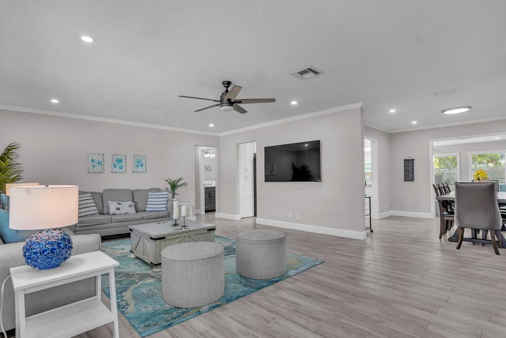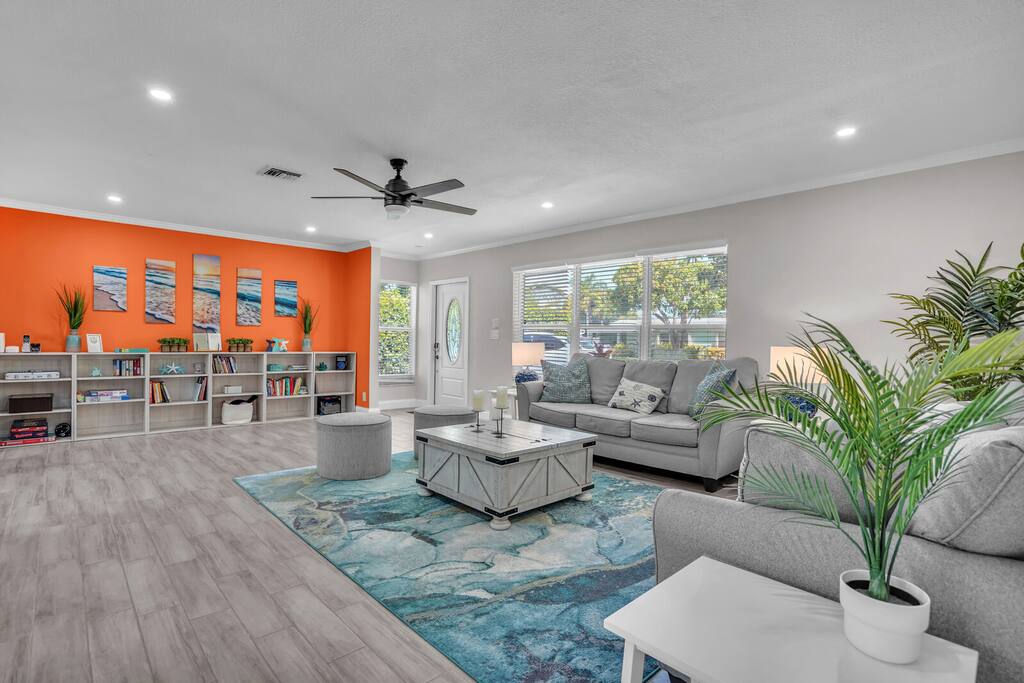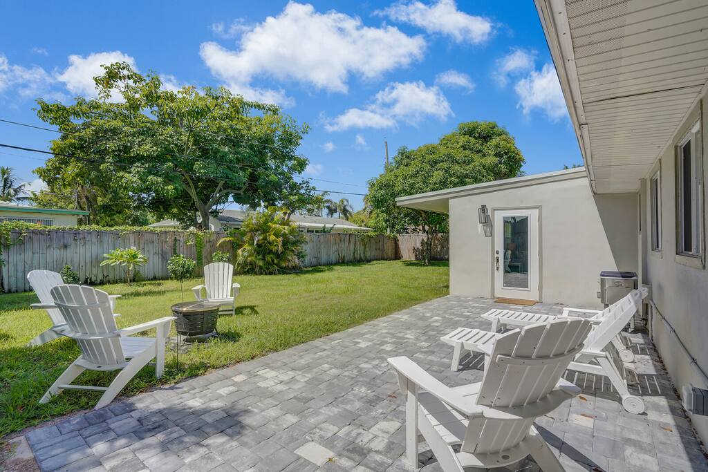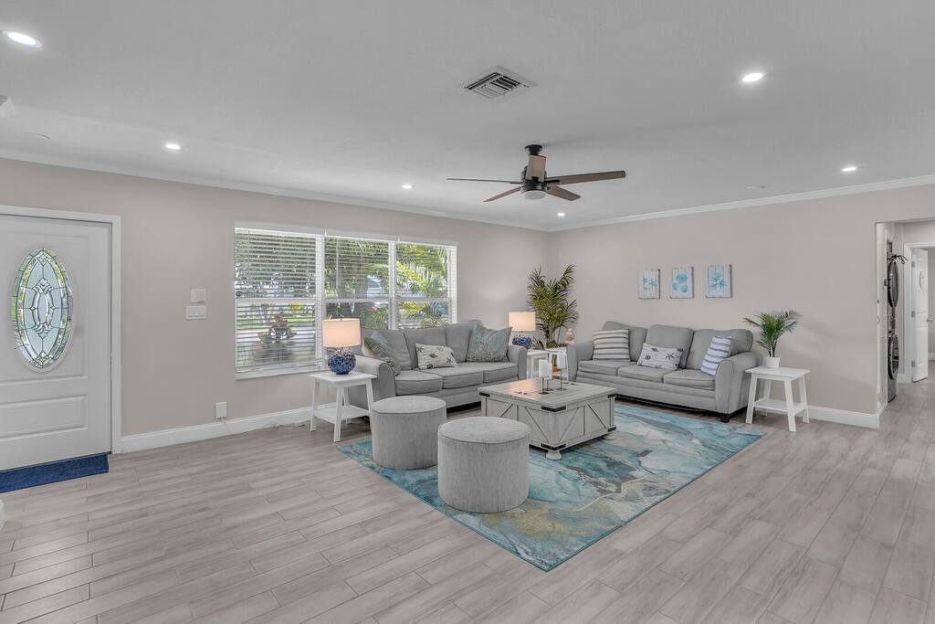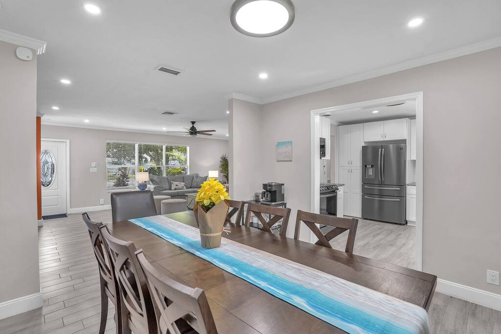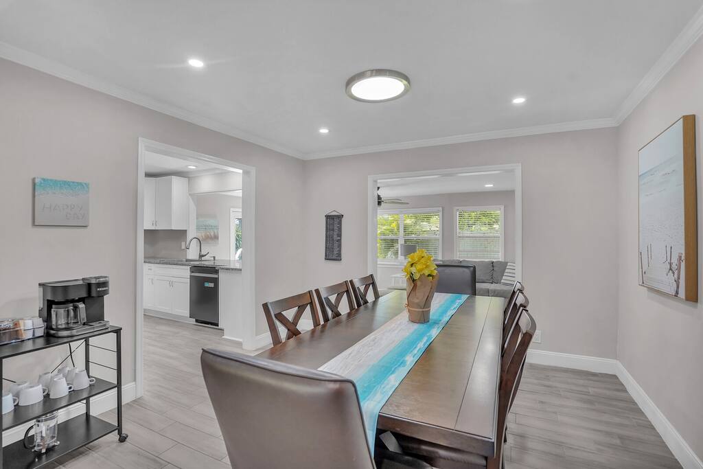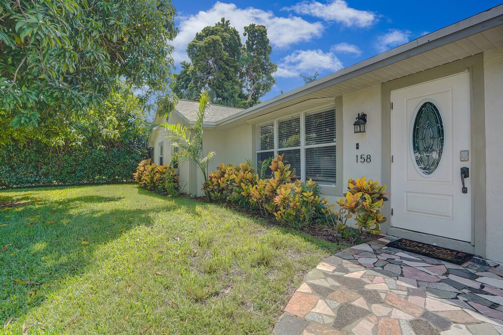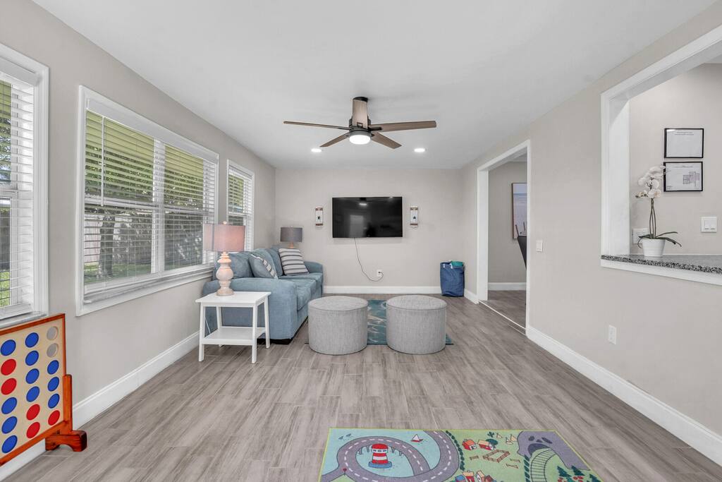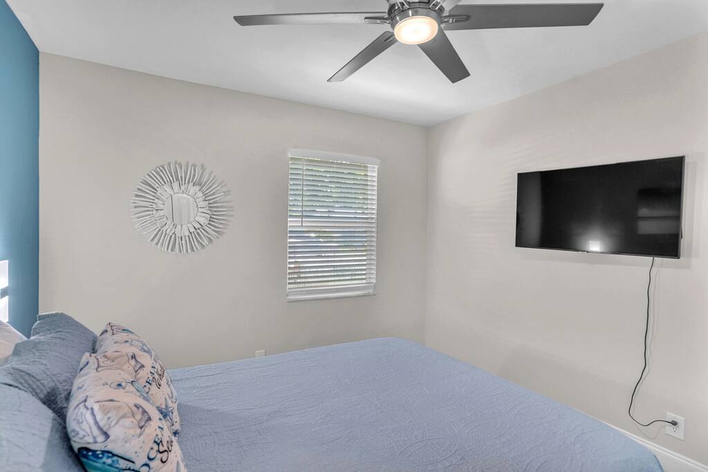 This recently-renovated single-level retreat features tile plank floors throughout, air conditioning and ceiling fans in every room, cordless blinds, and high-end appliances. The home offers 2 spacious living areas, a large dining table, 3 bedrooms, and a private backyard with a NEW large patio. Outdoor group games like cornhole and giant yard dice are provided, in addition to board games and indoor games if the weather isn’t ideal for outdoor fun. All visits 28 days or longer require signing a lease by all individuals 18+ at least 2 weeks prior to the stay. :-) GREAT ROOM Step into a generously sized great room with two full-sized couches (one a queen sleeper sofa) and a 65" flat-screen TV with Roku, giving you access to your personal streaming apps like Netflix, Amazon Prime, Disney+, and Hulu. Roku's guest mode automatically logs out of all apps at the end of your stay. DINING ROOM The great room opens to the dining room, featuring an expandable table with seating for 8–10. KITCHEN The well-appointed kitchen includes a toaster oven, blender, food processor, pots & pans, colanders, a Keurig combo coffee maker, and a healthy assortment of cooking utensils. It can be accessed from both the Great Room and Dining Room and overlooks the Florida Room. FLORIDA ROOM The Florida Room is a second living space at the back of the house, filled with natural light from south-facing windows. It includes another full-size sofa, a 58" TV, and space for a kids’ play area- perfect for little ones to enjoy while you relax. OUTSIDE The Florida Room opens to a private, fully fenced backyard (over 2,200 sq. ft.) with plenty of room for outdoor games and relaxation. Enjoy the NEW 300 square foot patio, chaise loungers and Adirondack chairs for sun or reading, a smokeless fire pit (S'mores, anyone?), and a pair of mango trees- feel free to help yourself when in season. If bringing your dog, let us know so we can leave out dog toys. BEDROOMS The hallway off the Great Room leads to the bedrooms and bathrooms. The primary bedroom has a king bed, a Roku TV (bring your streaming passwords; guest mode automatically signs you out at checkout!), and an en-suite bathroom with dual vanities and a shower with multiple settings, including a rainfall option. The 2nd and 3rd bedrooms each feature a queen bed, a Roku TV, and blackout curtains. Bedroom 2 also features a workspace (42” desk, monitor, and ergonomic desk chair). All bedrooms have remote-controlled ceiling fans, USB charging plugs, nightstands, and ample closet and drawer space. BATHROOMS The primary bathroom is a ¾ bath with dual vanities and a multi-setting shower. Guests have access to a hairdryer and starter toiletries. The 2nd bathroom features a combination tub/shower, plenty of counter space, and a spa tray for wine and Kindle enjoyment. BEACH SUPPLIES The guest closet between the primary and 2nd bedrooms houses beach supplies: beach toys, a beach blanket, a backpack cooler, 2 chairs, a beach umbrella, and towels for easy beach days.