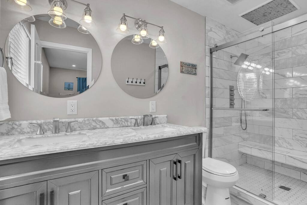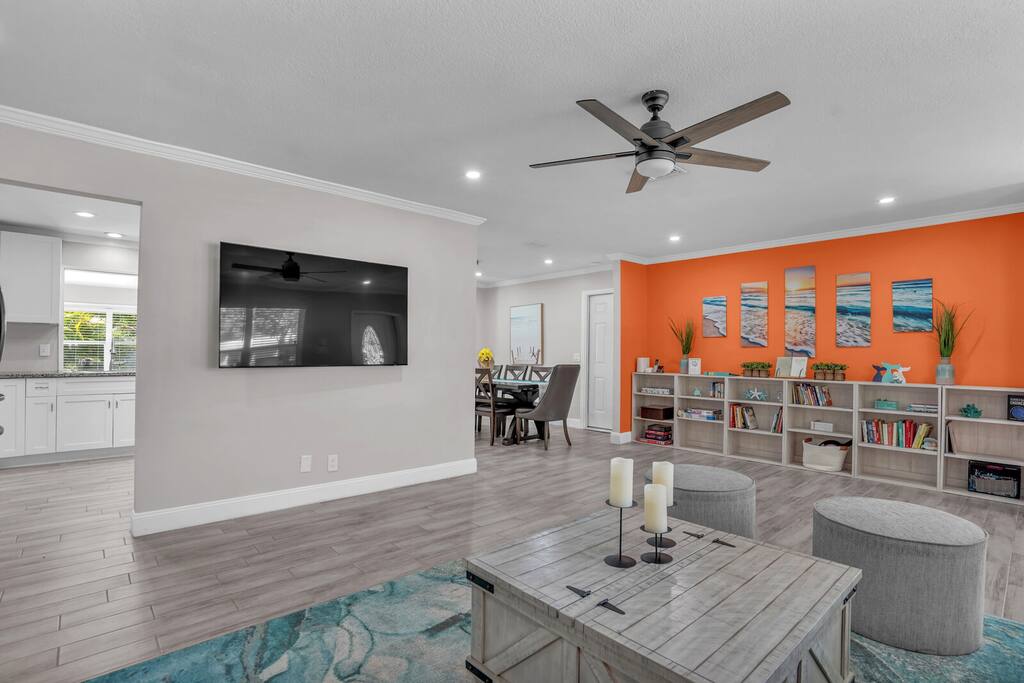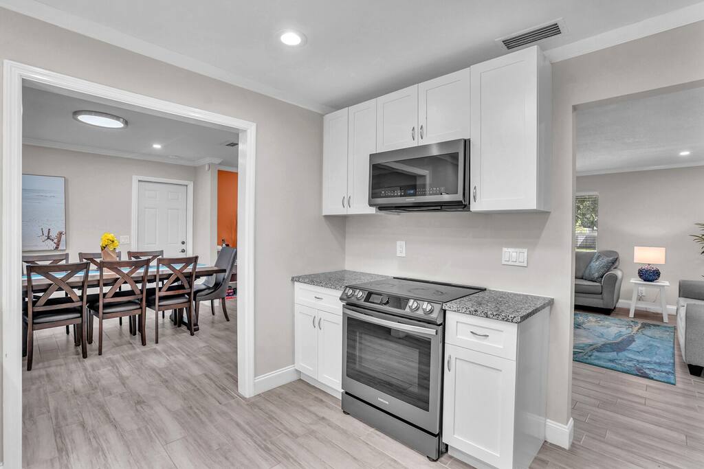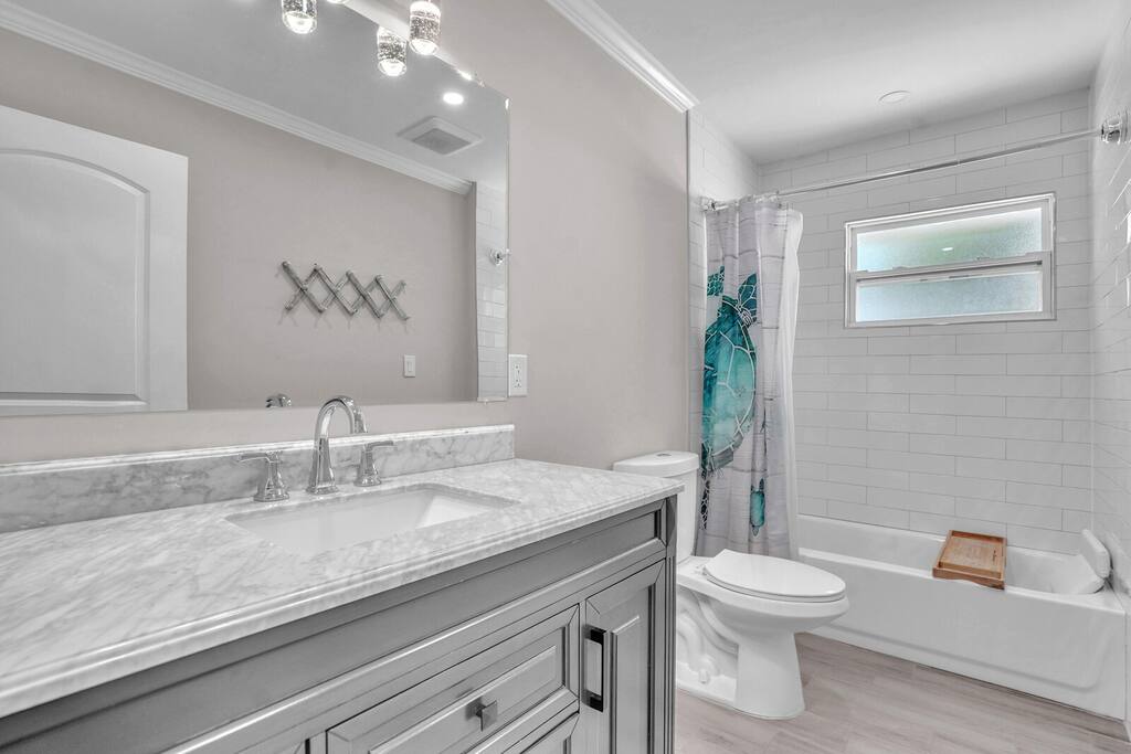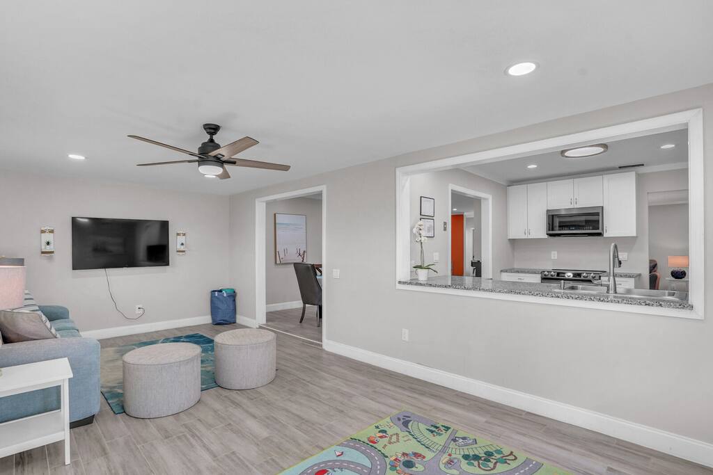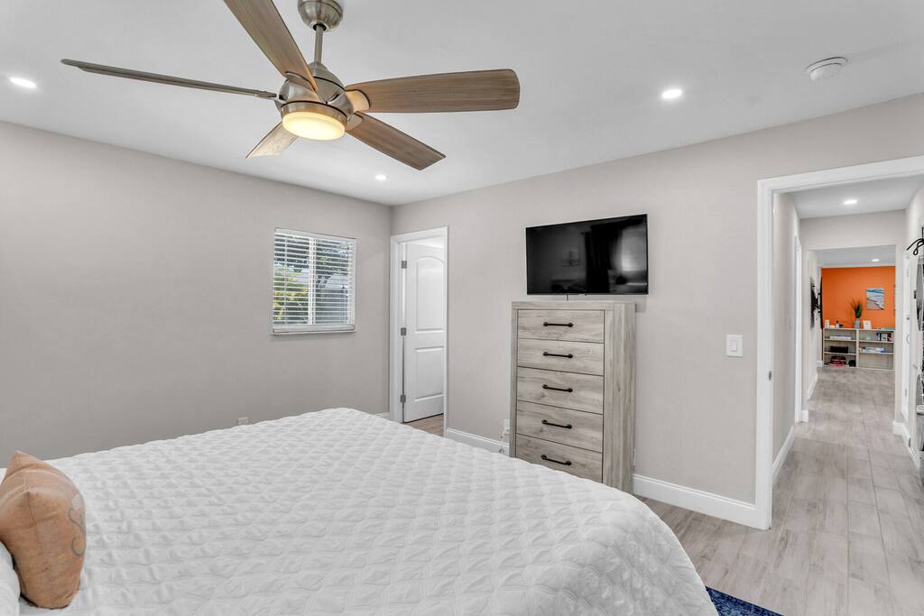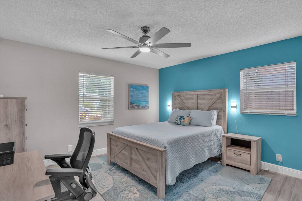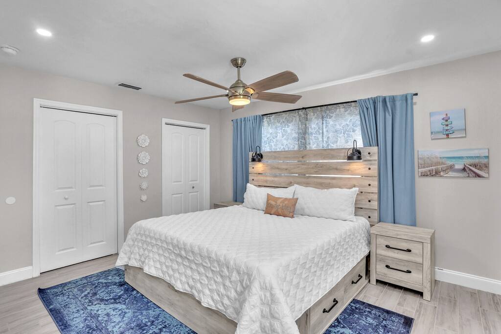 This recently-renovated single-level retreat features tile plank floors throughout, air conditioning and ceiling fans in every room, cordless blinds, and high-end appliances. The home offers 2 spacious living areas, a large dining table, 3 bedrooms, and a private backyard with a NEW large patio. Outdoor group games like cornhole and giant yard dice are provided, in addition to board games and indoor games if the weather isn’t ideal for outdoor fun. All visits 28 days or longer require signing a lease by all individuals 18+ at least 2 weeks prior to the stay. :-) GREAT ROOM Step into a generously sized great room with two full-sized couches (one a queen sleeper sofa) and a 65" flat-screen TV with Roku, giving you access to your personal streaming apps like Netflix, Amazon Prime, Disney+, and Hulu. Roku's guest mode automatically logs out of all apps at the end of your stay. DINING ROOM The great room opens to the dining room, featuring an expandable table with seating for 8–10. KITCHEN The well-appointed kitchen includes a toaster oven, blender, food processor, pots & pans, colanders, a Keurig combo coffee maker, and a healthy assortment of cooking utensils. It can be accessed from both the Great Room and Dining Room and overlooks the Florida Room. FLORIDA ROOM The Florida Room is a second living space at the back of the house, filled with natural light from south-facing windows. It includes another full-size sofa, a 58" TV, and space for a kids’ play area- perfect for little ones to enjoy while you relax. OUTSIDE The Florida Room opens to a private, fully fenced backyard (over 2,200 sq. ft.) with plenty of room for outdoor games and relaxation. Enjoy the NEW 300 square foot patio, chaise loungers and Adirondack chairs for sun or reading, a smokeless fire pit (S'mores, anyone?), and a pair of mango trees- feel free to help yourself when in season. If bringing your dog, let us know so we can leave out dog toys. BEDROOMS The hallway off the Great Room leads to the bedrooms and bathrooms. The primary bedroom has a king bed, a Roku TV (bring your streaming passwords; guest mode automatically signs you out at checkout!), and an en-suite bathroom with dual vanities and a shower with multiple settings, including a rainfall option. The 2nd and 3rd bedrooms each feature a queen bed, a Roku TV, and blackout curtains. Bedroom 2 also features a workspace (42” desk, monitor, and ergonomic desk chair). All bedrooms have remote-controlled ceiling fans, USB charging plugs, nightstands, and ample closet and drawer space. BATHROOMS The primary bathroom is a ¾ bath with dual vanities and a multi-setting shower. Guests have access to a hairdryer and starter toiletries. The 2nd bathroom features a combination tub/shower, plenty of counter space, and a spa tray for wine and Kindle enjoyment. BEACH SUPPLIES The guest closet between the primary and 2nd bedrooms houses beach supplies: beach toys, a beach blanket, a backpack cooler, 2 chairs, a beach umbrella, and towels for easy beach days.
